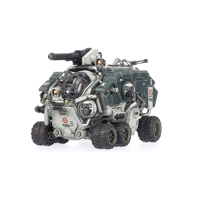 This multipart plastic kit builds one Hekaton Land Fortress, an indomitable heavy transport loaded with powerful guns. This mighty six-wheeled vehicle can be built with one of three powerful, adjustable turret weapons – a cyclic ion cannon to gun down the heaviest infantry, an SP heavy conversion beamer to carve a swathe through any target, or a heavy magna-rail cannon that can reduce even the toughest tanks to slag. This main gun is reinforced by two pairs of adjustable ball-turret sponson weapons – either bolt cannons or ion beamers.